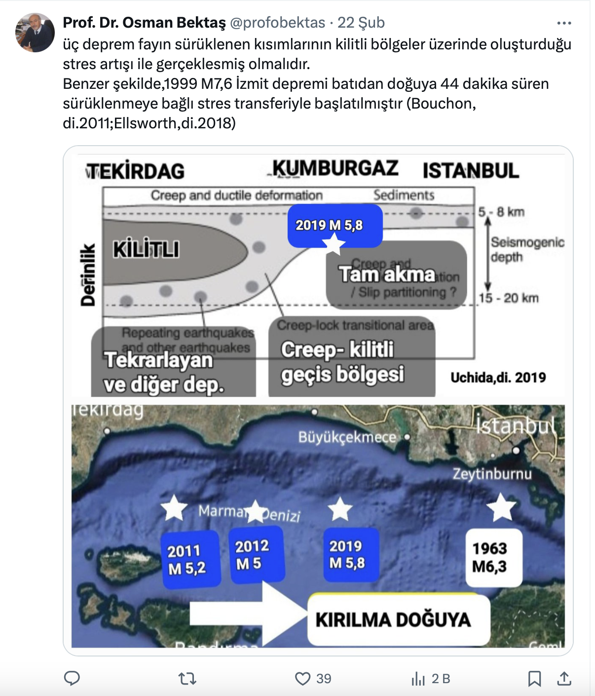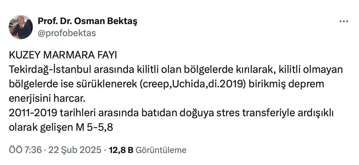 Prof. Dr. Osman Bektaş resmi sosyal medya hesabı https://x.com/profobektas üzerinden yaptığı paylaşımda “Tekirdağ-İstanbul arasında kilitli bölgelerde kırılarak, kilitli olmayan bölgelerde sürüklenerek birikmiş deprem enerjisini harcar" ifadelerini kullandı.