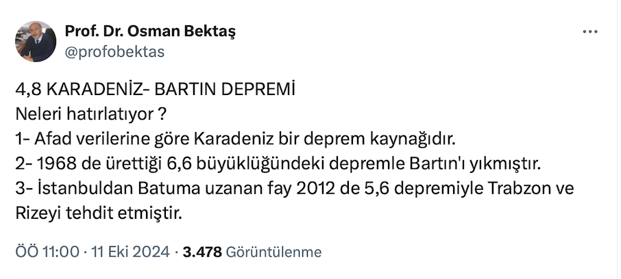 Prof. Dr. Osman Bektaş resmi sosyal medya hesabı https://x.com/profobektas üzerinden yaptığı paylaşımda daha önce yaşanan Bartın depremini de hatırlatarak “1968 de ürettiği 6,6 büyüklüğündeki depremle Bartın'ı yıkmıştır. İstanbul’dan Batum’a uzanan fay 2012 de 5,6 depremiyle Trabzon ve Rize’yi tehdit etmiştir.” ifadelerini kullandı.