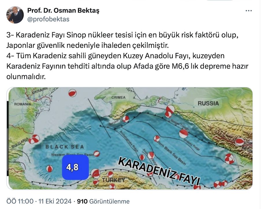 Osman Bektaş yaptığı paylaşımda “Tüm Karadeniz sahili güneyden Kuzey Anadolu Fayı, kuzeyden Karadeniz Fayının tehdidi altında olup AFAD’a göre M6,6’lık depreme hazır olunmalıdır.” uyarısı da yaptı.