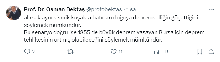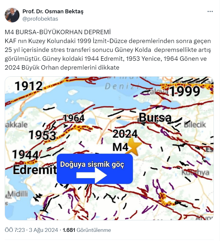 Osman Bektaş resmi sosyal medya hesabı https://x.com/profobektas üzerinden yaptığı paylaşımda Kuzey Anadolu Fayı'nın Kuzey Kolundaki 1999 İzmit-Düzce depremlerinden sonra geçen 25 yıl içerisinde stres transferi sonucu Güney Kolda depremsellikte artış görüldüğünü belirterek, "Güney koldaki 1944 Edremit, 1953 Yenice, 1964 Gönen ve 2024 Büyük Orhan depremlerini dikkate alırsak aynı sismik kuşakta batıdan doğuya depremselliğin göç ettiğini söylemek mümkündür. Bu senaryo doğru ise 1855 de büyük deprem yaşayan Bursa için deprem tehlikesinin artmış olabileceğini söylemek mümkündür." ifadelerini kullandı.