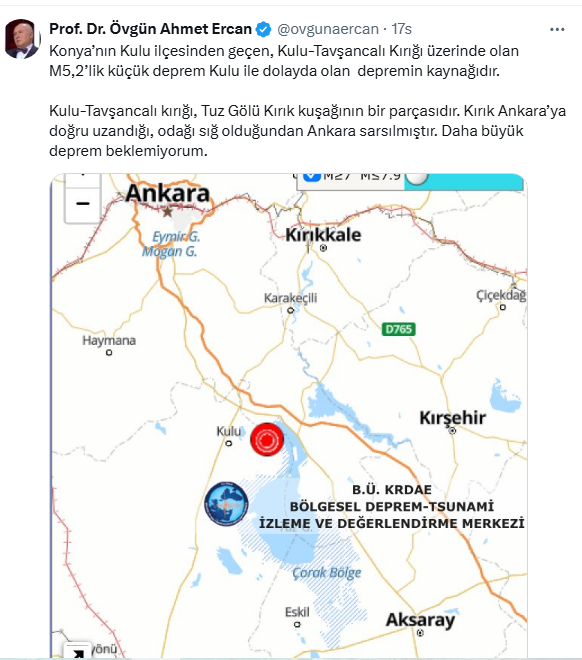 Konya’nın Kulu ilçesinden geçen, Kulu-Tavşancalı Kırığı üzerinde olan M5,2’lik depremi değerlendiren Prof. Dr. Övgün Ahmet Ercan Konya'da büyük deprem beklemediğini açıkladı.