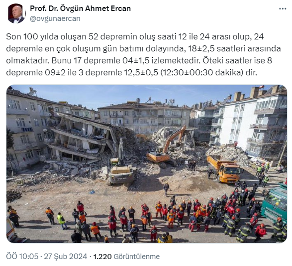 Yaptığı deprem yorumları ile dikkatleri üzerine çeken Prof. Dr. Övgün Ahmet Ercan'dan yine çok konuşulacak açıklama geldi. Ercan son 100 yılda depremlerin en çok hangi saat aralığında olduğunu duyurdu. Depremlerin meydana geliş saatlerini değerlendiren Ercan peş peşe saat açıklaması yaptı. Ercan'ın sosyal medya hesabı X'ten yaptığı açıklama depremlerin en çok hangi saatlerde olduğunu gözler önüne serdi. İşte Ercan'ın o açıklaması ve gelen yorumlar...