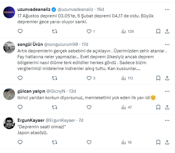 uzunvadeanaliz @uzunvadeanaliz: ''17 Ağustos depremi 03.05'te, 6 Şubat depremi 04,17 de oldu. Büyük depremler gece yarısı oluyor sanki.''