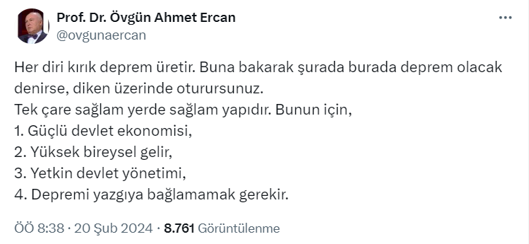 Jeofizik Mühendisi Prof. Dr. Övgün Ahmet Ercan sosyal medya hesabı üzerinden yaptığı paylaşımda her diri fay kırığının deprem üreteceğini dile getirerek, “Buna bakarak şurada burada deprem olacak denirse, diken üzerinde oturursunuz” dedi. Övgün Ahmet Ercan paylaşımında tek çarenin sağlam yapı olduğunu da belirtti.