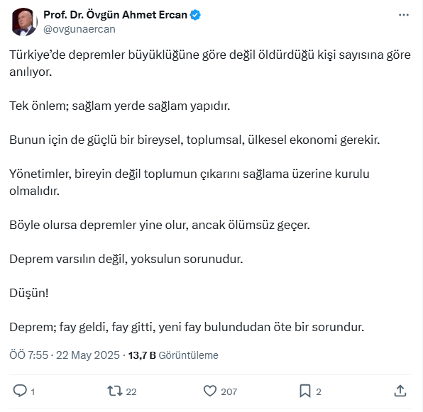 Bunun için de güçlü bir bireysel, toplumsal, ülkesel ekonominin gerekli olduğuna vurgu yapan Ercan, 'Deprem varsılın değil, yoksulun sorunudur. Deprem; fay geldi, fay gitti, yeni fay bulundudan öte bir sorundur.' dedi.