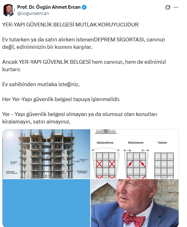 Ercan, sosyal medya hesabı X'ten 'Yer-Yapı güvenlik belgesi' mutlak koruyucudur diyerek vatandaşlara seslendi.