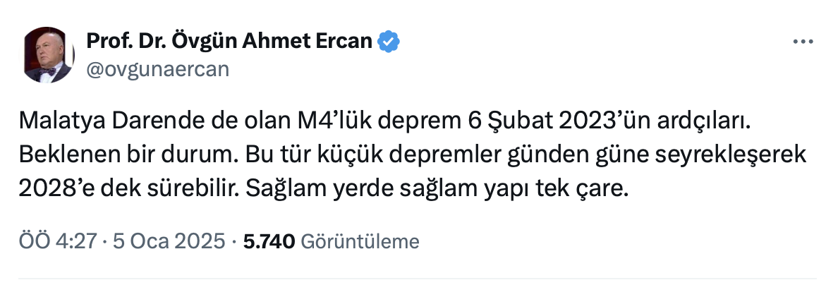 Türkiye'de hemen her gün irili ufaklı depremler meydana geliyor. Son olarak Malatya'nın Darende ilçesinde 4 büyüklüğünde yaşanan depremden sonra Prof. Dr. Ahmet Ercan’dan da konu ile ilgili bir paylaşım geldi.