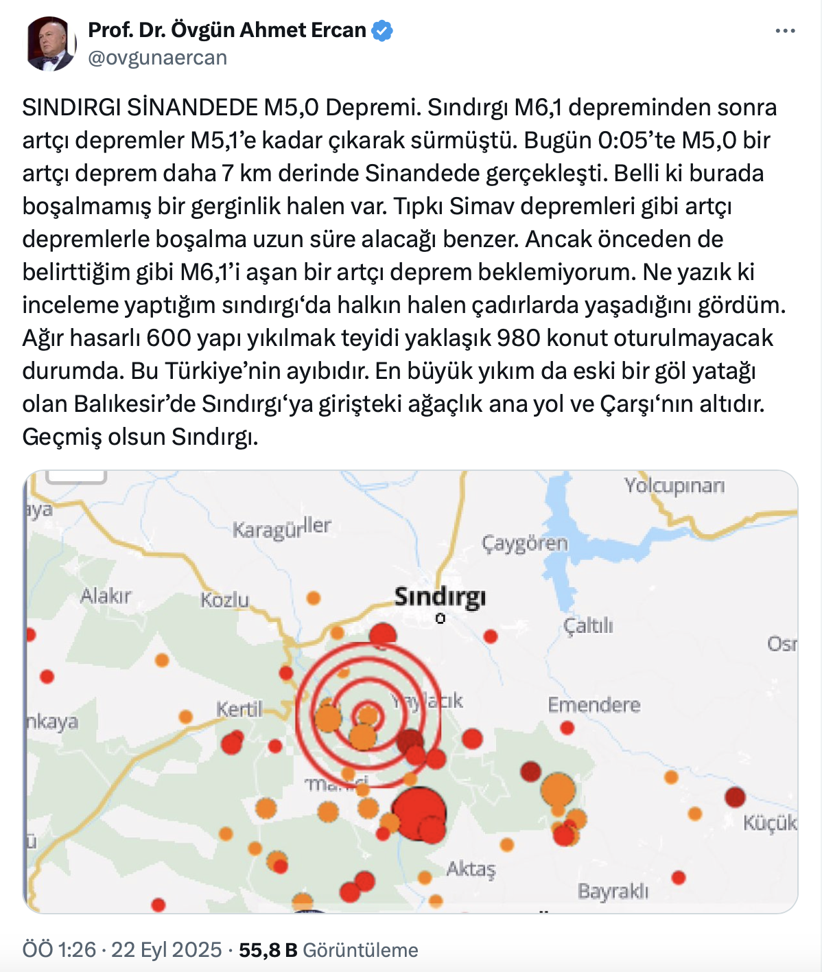 Prof. Dr. Övgün Ahmet Ercan resmi sosyal medya hesabı üzerinden Sındırgı depremi ile ilgili olarak bir açıklama yaparak, “6,1’i aşan bir artçı deprem beklemiyorum” dedi.