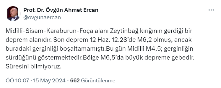 Prof. Dr. Övgün Ahmet Ercan resmi X hesabı https://twitter.com/ovgunaercan üzerinden yaptığı paylaşımda Midilli-Sisam-Karaburun-Foça alanının Zeytinbağ kırığının gerdiği bir deprem alanı olduğunu belirterek, "Son deprem 12 Haz. 12.28’de M6,2 olmuş, ancak buradaki gerginliği boşaltamamıştı. Bu gün Midilli M4,5; gerginliğin sürdüğünü göstermektedir. Bölge M6,5’da büyük depreme gebedir. Süresini bilmiyoruz." ifadelerini kullandı.