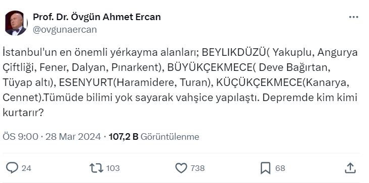 Prof. Dr. Övgün Ahmet Ercan'ın paylaşımı şu şekilde: