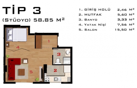 1+0 daire planı
