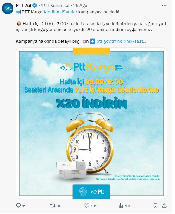 PTT AŞ, kargo sürecini daha verimli hale getirmek ve müşteri memnuniyetini artırmak amacı ile sosyal medya hesabı X üzerinden yaptığı duyuru kapsamında, "İndirimli Saatler" kampanyası başlattığını duyurdu. Buan göre, kampanya ile bireysel müşteriler, hafta içi her gün 09.00-12.00 saat aralığında gönderdikleri standart taşıma ve adres teslim gönderilerinde özel bir indirim fırsatından yaralanacaklar.