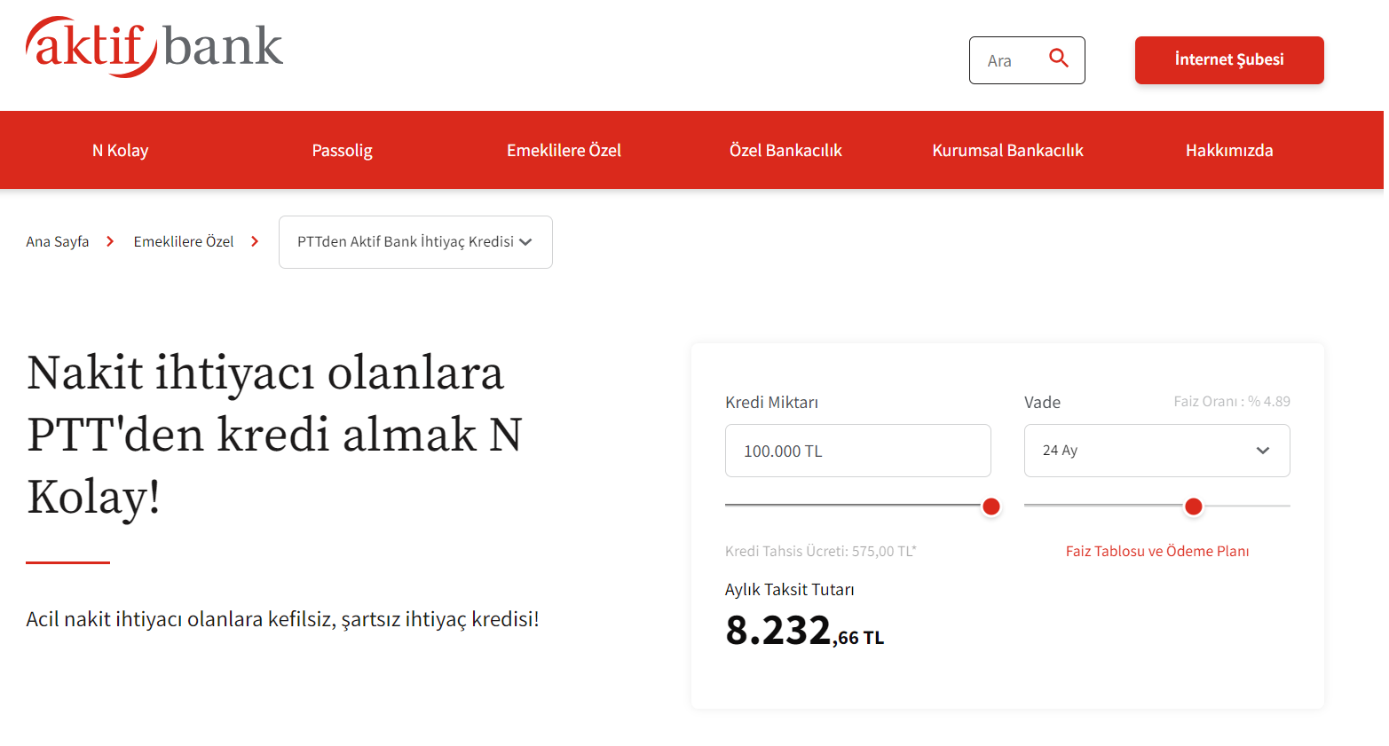 PTT üzerinden emeklilere tam 100 bin TL’ye düşük faizli kredi ödemesi verilecek. PTT vasıtasıyla Aktifbank’tan yatacak olan kredi için en yüksek tutar 100 bin TL olarak açıklandı.