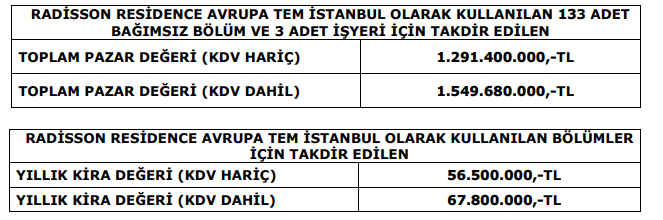 Radisson Residence Avrupa TEM İstanbul olarak kullanılan bölümler için takdir edilen yıllık kira bedeli KDV hariç 56 milyon 500 bin TL, KDV dahil kira değeri ise 67 milyon 800 bin TL olarak belirtildi.