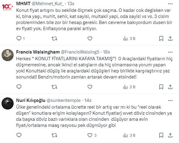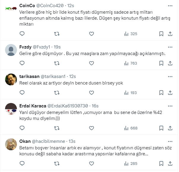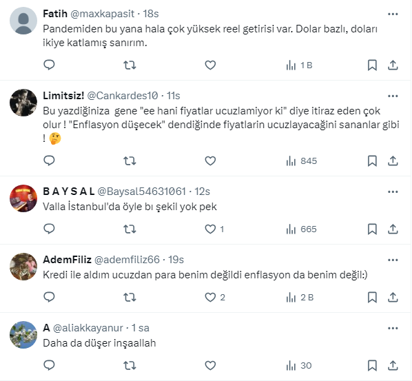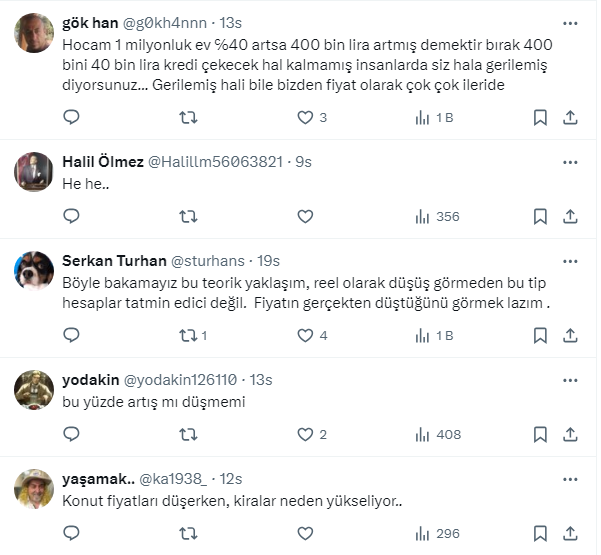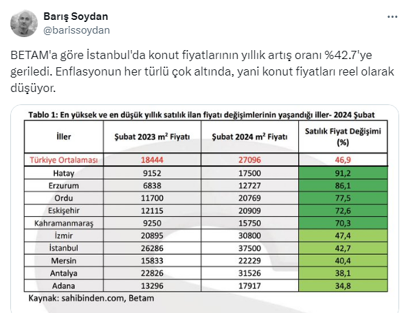 BETAM tarafından açıklanan raporu değerlendiren Ekonomist Barış Soydan https://twitter.com/barissoydan X sosyal medya hesabından yaptığı paylaşımda, “BETAM’a göre İstanbul'da konut fiyatlarının yıllık artış oranı yüzde 42.7'ye geriledi. Enflasyonun her türlü çok altında, yani konut fiyatları reel olarak düşüyor” dedi. Fiyatlardaki değişimle ilgili bir de grafik paylaşan Soydan’ın takipçileri piyasada bu düşüsü hissedemediklerini söyledi.
