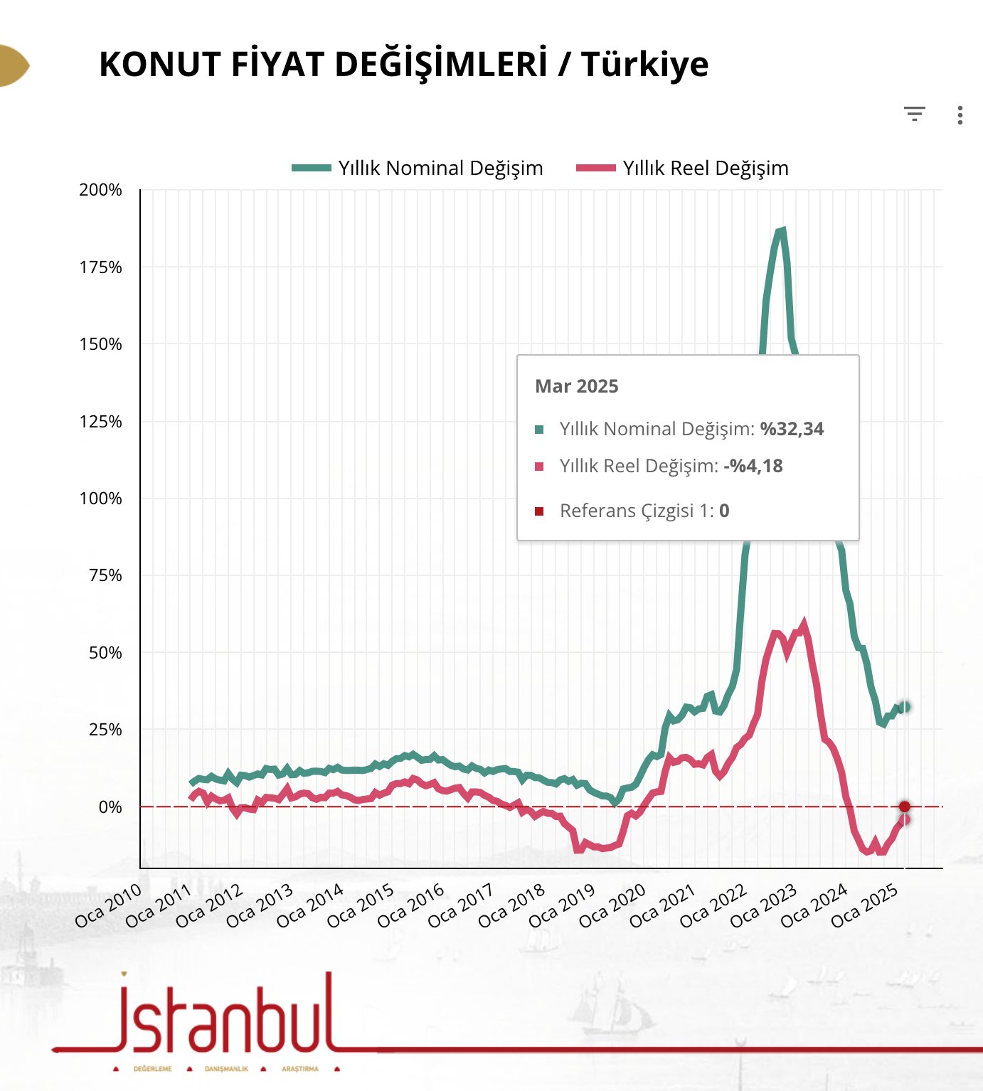 Merkez Bankası’nın yayımladığı söz konusu verilere göre Türkiye genelinde konut fiyatları, Konut Fiyat Endeksi 2025 yılı Şubat ayında bir önceki aya göre yüzde 2,8 oranında artış gösteren KFE, bir önceki yılın aynı ayına göre nominal olarak yüzde 31,3 oranında artmış, reel olarak ise yüzde 5,6 oranında azalma gösterdi.