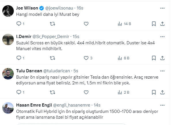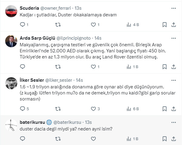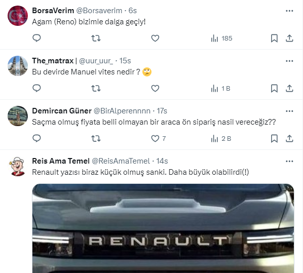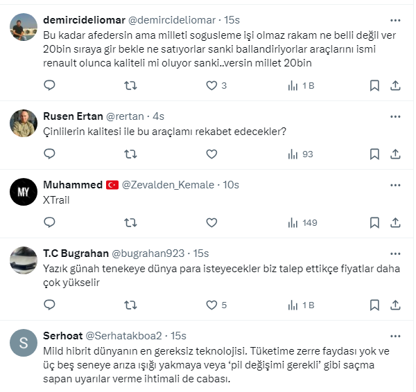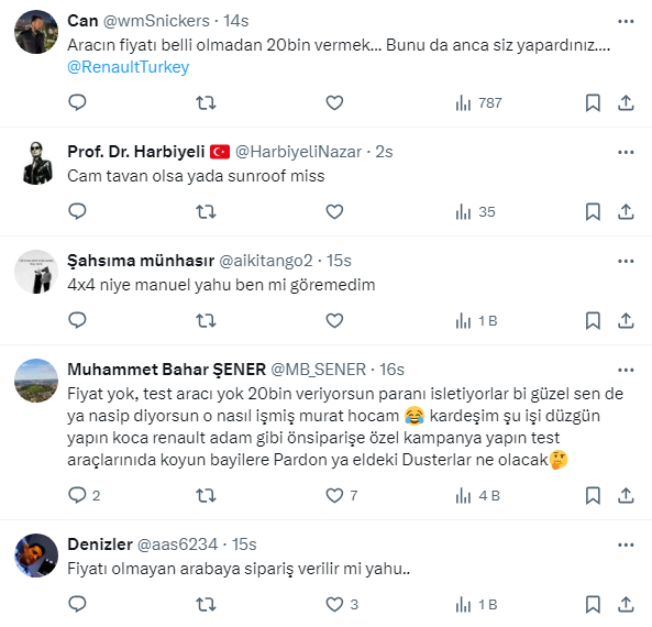 Otomotiv Gazetecisi Murat https://x.com/murattosunaraba X sosyal medya hesabından yaptğı paylaşımda, Renault Duster için 20 bin TL depozitoyla ön siparişlerin açıldığını ve Temmuz, Ağustos gibi teslimlerin başlayacağını belirtti. Vatandaş ön sipariş uygulamasını anlamsız bulurken, TOGG varken Renault Duster’ın işinin zor olduğunu söyledi.