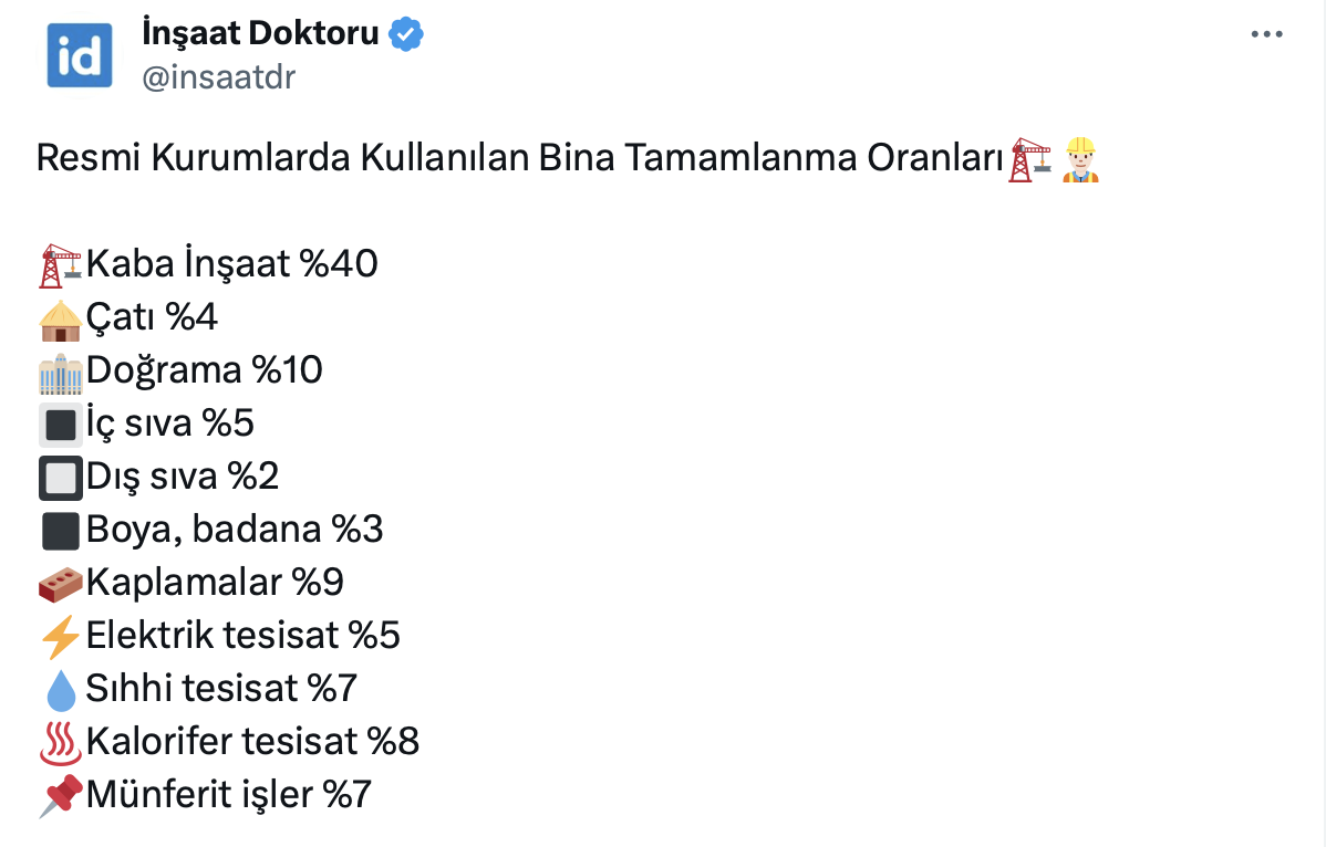 42 bin takipçili İnşaat Doktoru resmi X hesabı üzerinden yaptığı paylaşımda resmi kurumlarda kullanılan bina tamamlanma oranlarını açıkladı.