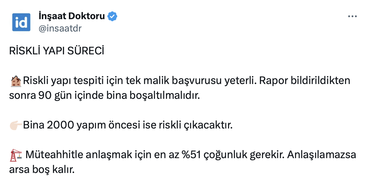 İnşaat ve konut sektörü ile ilgili yaptığı paylaşımlarla dikkat çeken 56,8 bin takipçili İnşaat Doktoru resmi X hesabı https://twitter.com/insaatdr üzerinden bu kez de riskli yapı sürecini anlattı.