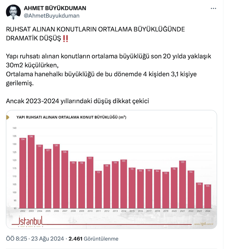 Gayrimenkul Değerleme Uzmanı Dr. Ahmet Büyükduman resmi X hesabı https://x.com/AhmetBuyukduman üzerinden yaptığı paylaşımda “Ruhsat alınan konutların ortalama büyüklüğünde dramatik düşüş” ifadelerini kullanarak, yapı ruhsatı alınan konutların ortalama büyüklüğünün son 20 yılda yaklaşık 30 metrekare küçülürken, ortalama hanehalkı büyüklüğünün de bu dönemde 4 kişiden 3,1 kişiye gerilediğini belirtti.
