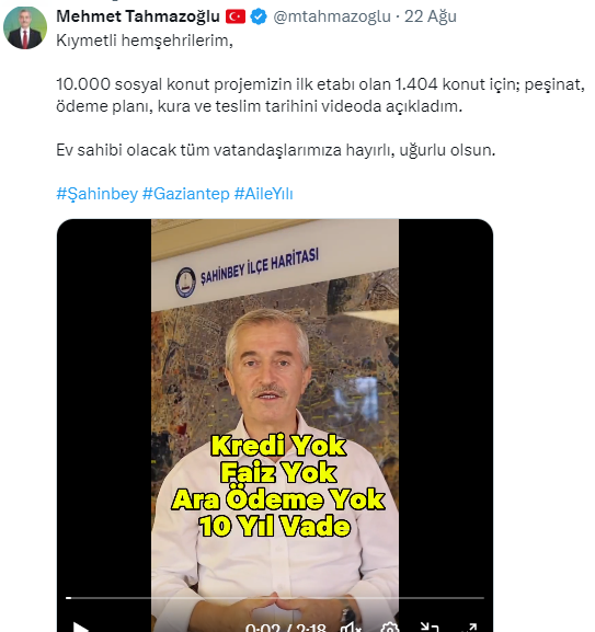 Şahinbey Belediye Başkanı Tahmazoğlu, sosyal medya hesabı X'ten 10 bin sosyal konut projesinde kredi, faiz ve ara ödeme olmadan vatandaşların 10 yıl vadeyle konut sahibi olabileceklerini açıkladı.