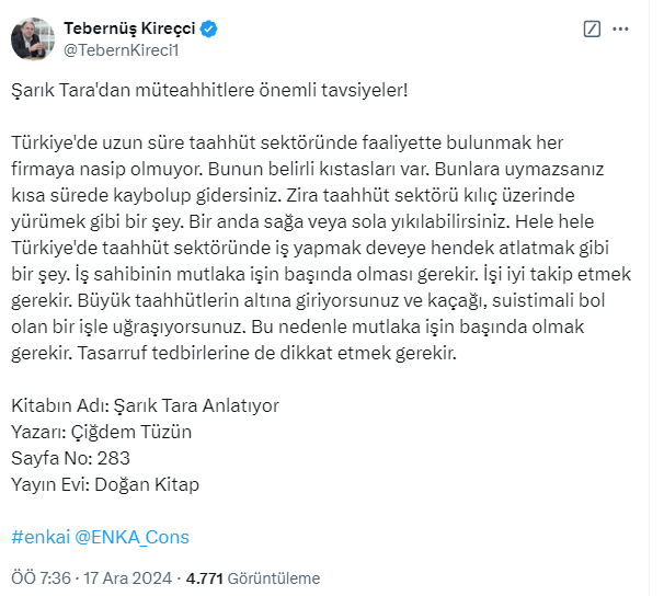 Türkiye'nin 1 numaralı emlak ve konut editörü Tebernüş Kireçci, X sosyal medya hesabından 'Şarık Tara Anlatıyor' kitabından alıntı yaparak 'Şarık Tara'dan müteahhitlere önemli tavsiyeler' paylaşımına yer verdi.