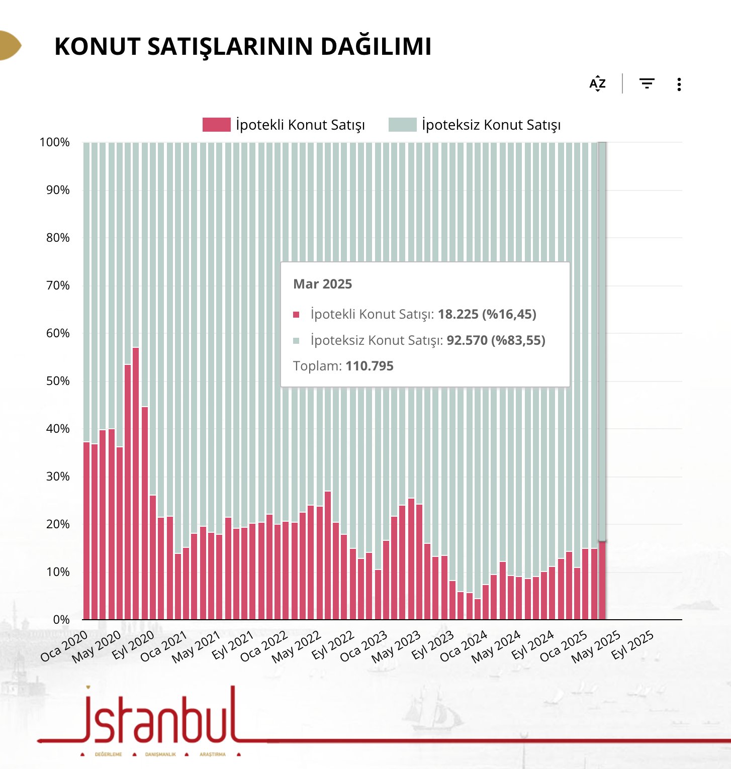 Söz konusu rakamlara göre ülke genelinde ipotekli konut satışları 2025 yılının Mart ayında bir önceki senenin aynı ayına göre yüzde 41,5 oranında arttı ve 18 bin 225 şeklinde oldu. TÜİK’in paylaştığı detaylara göre toplam konut satışları içinde ipotekli satışların payı yüzde 16,4 şeklinde gerçekleşti.