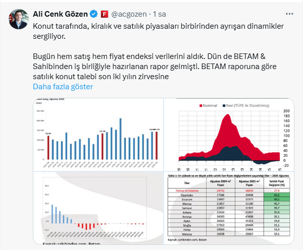Konut tarafında, kiralık ve satılık piyasaları birbirinden ayrışan dinamikler sergilediğini belirten Gözen satılık ve konut piyasasını sosyal medya hesabı X'ten değerlendirdi. İşte o paylaşım...