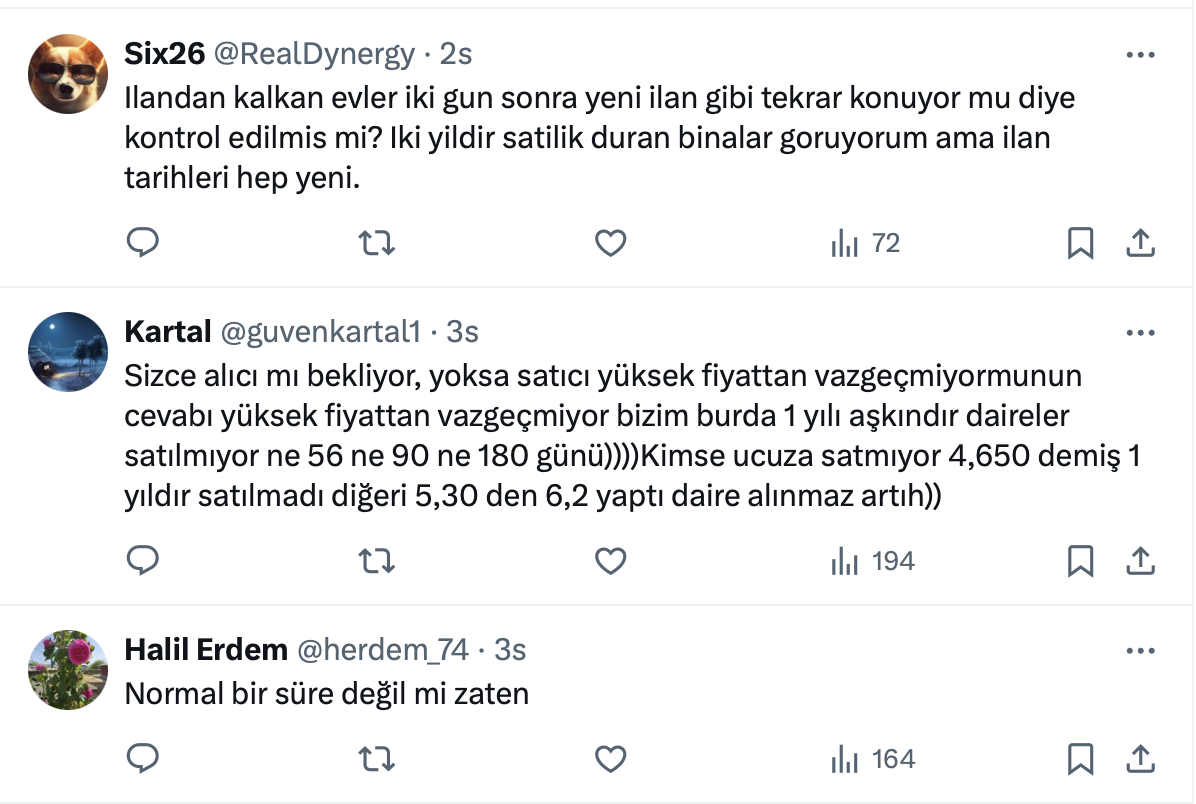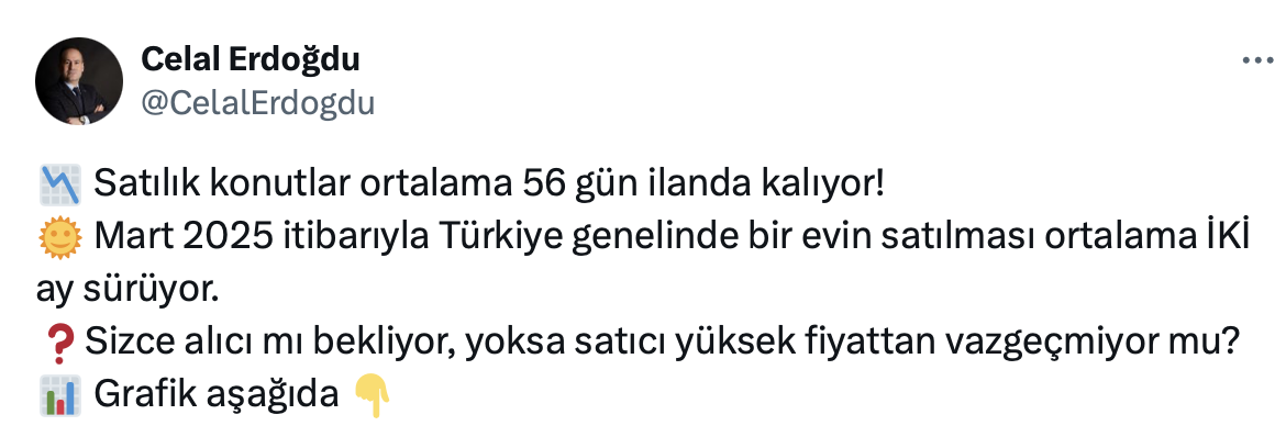 Celal Erdoğdu yaptığı paylaşımda satılık konutların ortalama 56 gün ilanda kaldığını belirtti.
