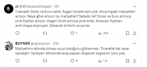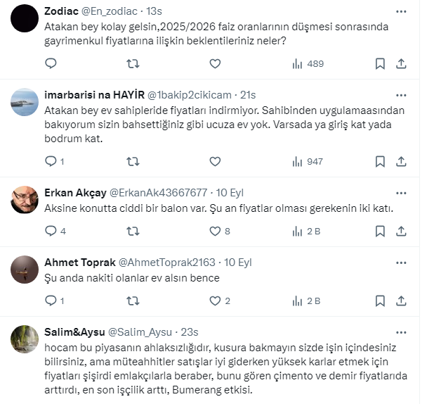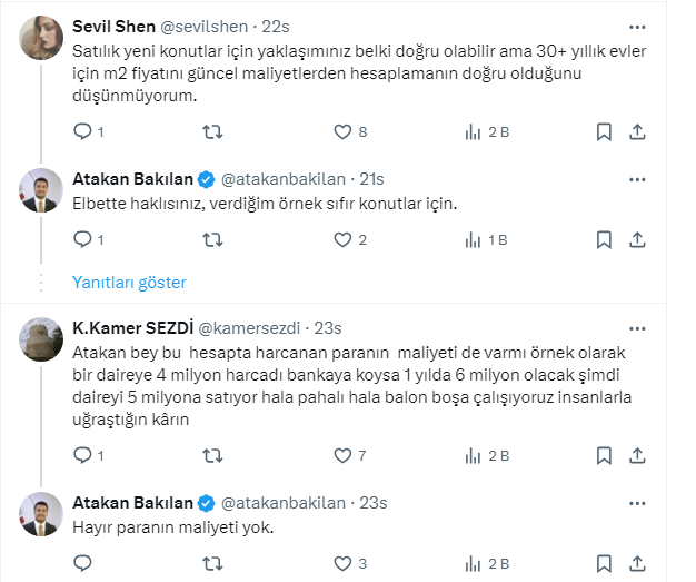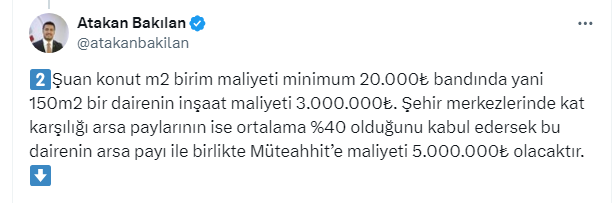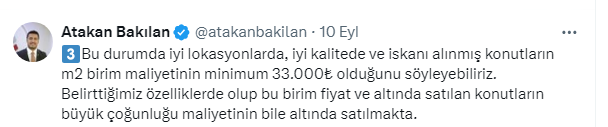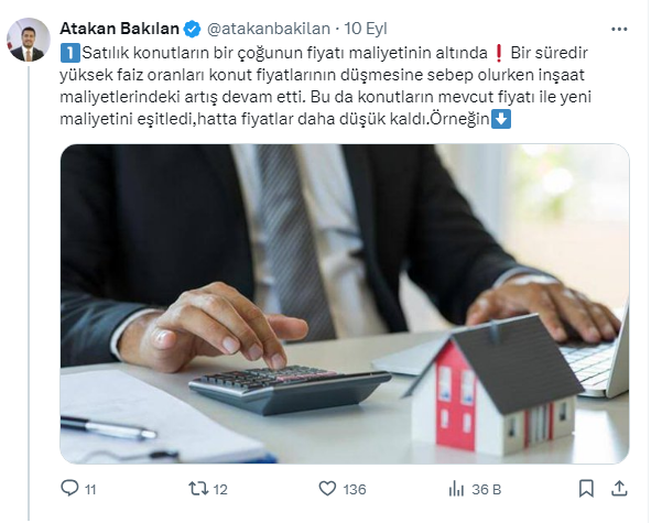 İnşaat Mühendisi, Eskişehir Ticaret Odası Meclis Üyesi ve TOBB Eskişehir Genç Girişimciler Kurulu İcra Komitesi Üyesi Atakan Bakılan https://x.com/atakanbakilan X sosyal medya hesabından yaptığı paylaşımda, satılık konutların birçoğunun fiyatının maliyetinin altında olduğunu söyledi. Bakılan bu söylemini de şöyle açıkladı: