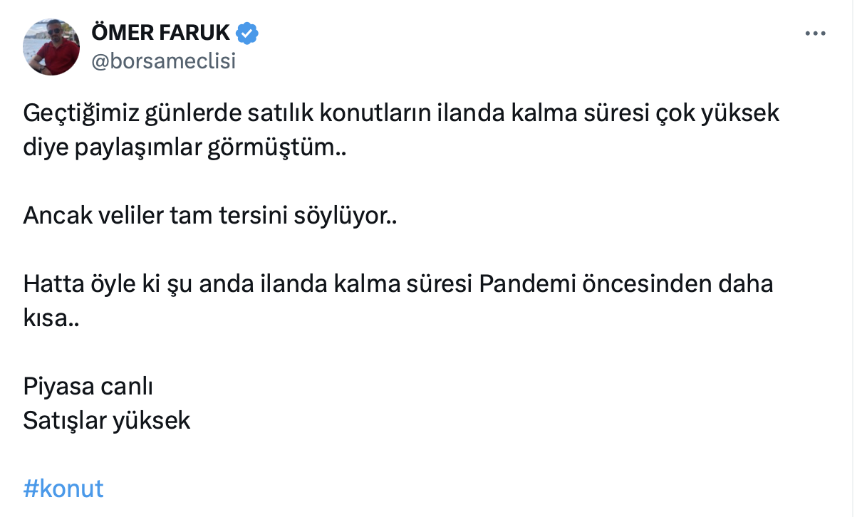 Ömer Faruk yaptığı paylaşımda satılık konutların ilanda kalma süresinin pandemi öncesinden daha kısa olduğunu belirtti.
