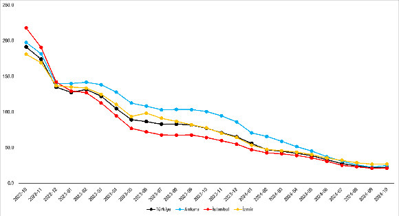 Ankara ve İzmir'de ise zirveye Eylül 2022’de ulaşılmış (yüzde 205,6 ve yüzde 183,1) Ekim 2024’te bu iki ilimizde yıllık artış oranları, sırasıyla, yüzde 24,7’e ve yüzde 26,7’ye geriledi.