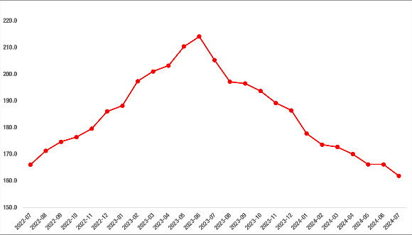 2023 Temmuz’dan bu yana gösterdiği düşüş 2024 Temmuz’da da devam etti. Reel konut fiyat endeksi Temmuz ayında Haziran’a kıyasla 4,3 puanlık bir azalışla 161,9 oldu. Haziran’dan Temmuz’a enflasyon oranı cari konut fiyat artış oranından daha yüksek bir düzeyde gerçekleşti.