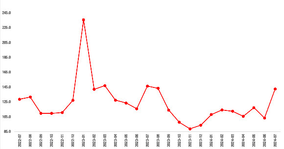 Aralık 2023’ten itibaren yönünü yukarı çeviren endeks Haziran’dan Temmuz’a yüzde 37,8’lik sert bir artışla 142,4’e geldi. Ancak endeks geçen yılın Temmuz ayına kıyasla yüzde 2,7 daha düşük.