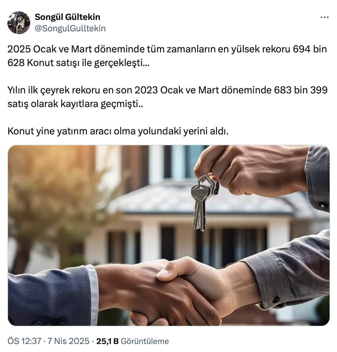 Gayrimenkul Uzmanı Songül Gültekin, resmi sosyal medya hesabı https://x.com/SongulGulltekin üzerinden yaptığı paylaşımda konut satışlarının rekor kırdığını belirterek, “Konut yine yatırım aracı olma yolundaki yerini aldı” dedi.