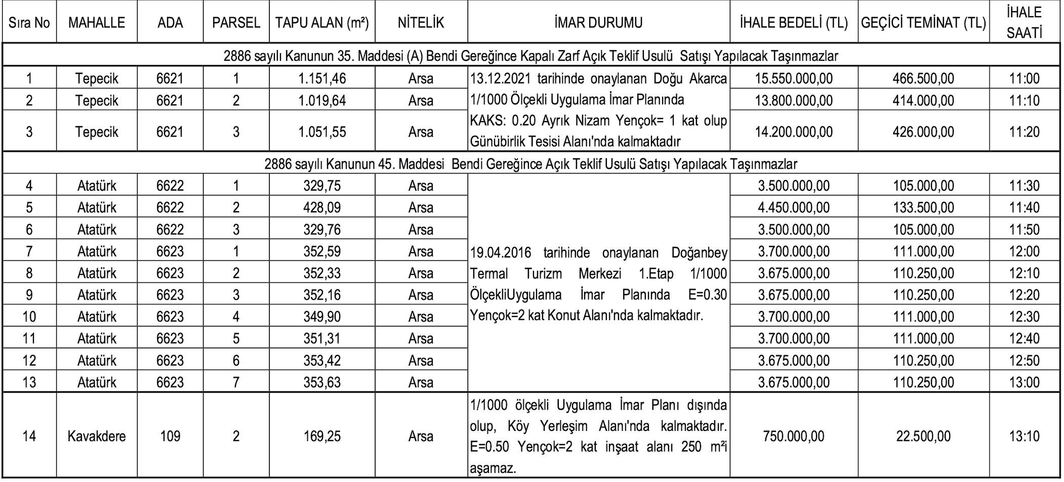 Madde 1. Aşağıda bilgileri bulunan taşınmazlar 2886 sayılı Kanunun 35. maddesi (a) bendine göre Kapalı Teklif Usulü ve 45. maddesine göre açık