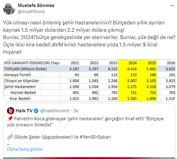 Şehir hastanelerine bütçeden ayrılan yıllık kaynak 1,5 milyar dolardan 2,2 milyar dolara çıktı. İktisatçı Mustafa Sönmez, Şehir hastanelerinin yıllık kira bedelinin 1,5 milyar dolar olduğunu açıkladı.