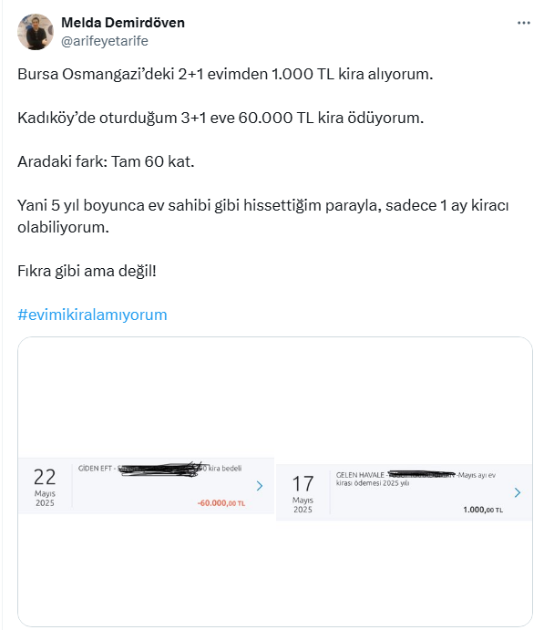 Şehirlere göre kira bedelleri arasında büyük uçurum oluşurken, sosyal medyanın gündemine düşen bir olay İstanbul'da kiraların ne kadar yüksek olduğunu bir kez daha gözler önüne serdi. Melde Demirdöven isimli ev sahibi 2+1 evinden bin lira kira aldığını, Kadıköy'de kiracı olarak yaşadığı 3+1 eve ise tam 60 bin lira kira ödediğini açıkladı.