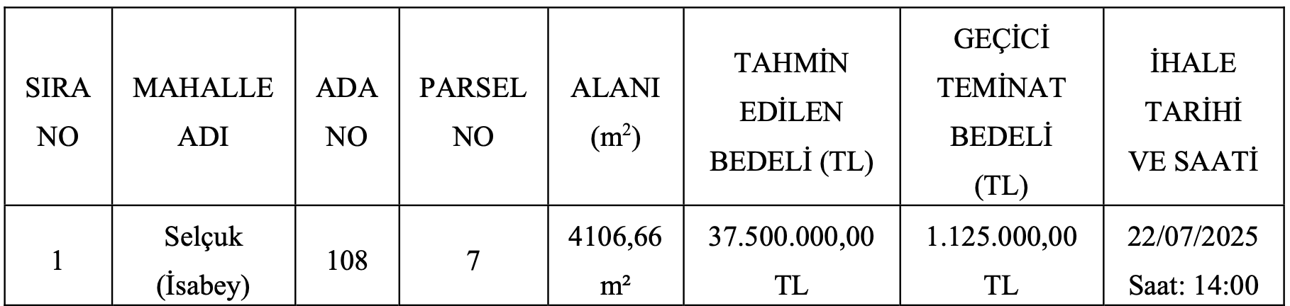 Selçuk Belediye Başkanlığı, İzmir Selçuk’ta yer alan arsayı 37 milyon 500 bin TL bedelle satışa çıkardı. Arsanın satış ihalesi 22 Temmuz tarihinde yapılacak.