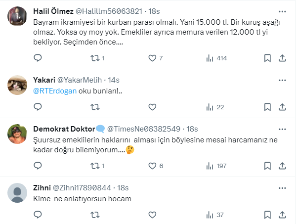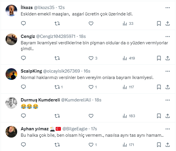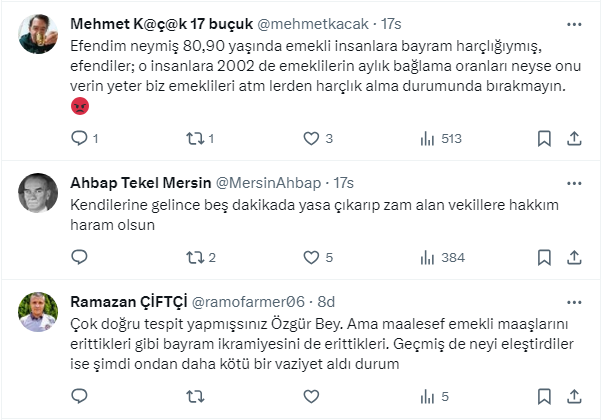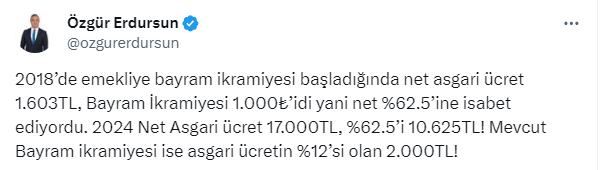 Özgür Erdursun’un hesabına göre emeklinin alması gereken bayram ikramiyesi tutarı tam 10 bin 625 TL. Bu rakamı twitter.com/ozgurerdursun X sosyal medya hesabından takipçileriyle paylaşan Erdursun’un gönderisine yorum yağdı.
