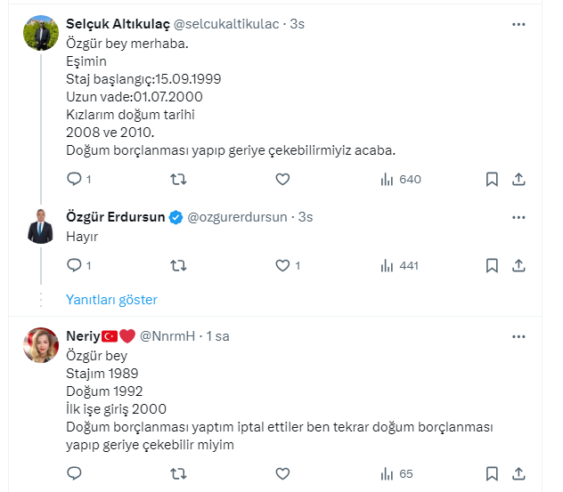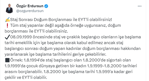 SGK uzmanı Özgür Erdursun, https://x.com/ozgurerdursun X sosyal medya hesabından yaptığı paylaşımda ''Staj Sonrası Doğum Borçlanması ile EYT'li olabilirsiniz'' dedi. Erdursun bu durumun kimleri kapsadığını belirtti. Erdursun, "Tüm staj yapanlar için geçerli değil; aşağıda belirttiğimiz koşullara uyuyorsanız, doğum borçlanması ile EYT kapsamına girebilirsiniz" diyerek şunları söyledi: