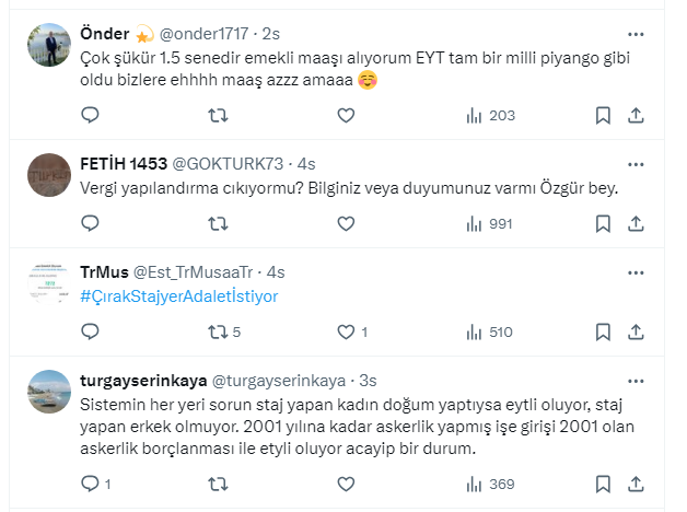 Milyonlarca çalışan Emeklilikte Yaşa Takılanlar (EYT) düzenlemesiyle 8 Eylül 1999 yılı öncesinde sigorta girişi olanlar, kademeli emeklilik yoluyla prim gün ve hizmet yılını tamamlayarak, yaş şartı aranmaksızın emeklilik hakkına sahip oldu. Düzenlemeye göre; staj sigortası olanlar, sigorta başlangıçlarının emeklilik için geçerli sayılmaması nedeniyle EYT kapsamına alınmadı.