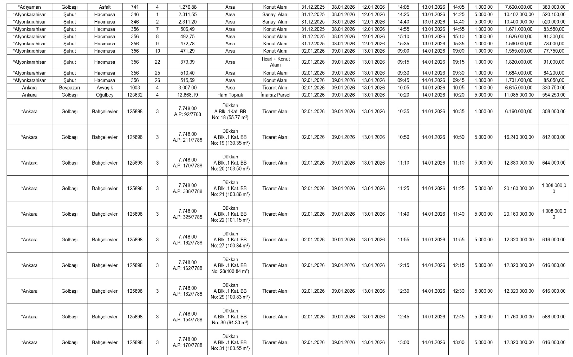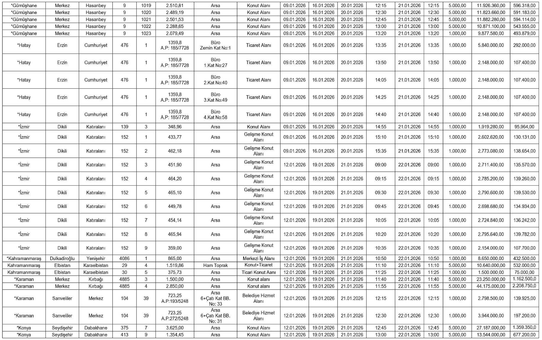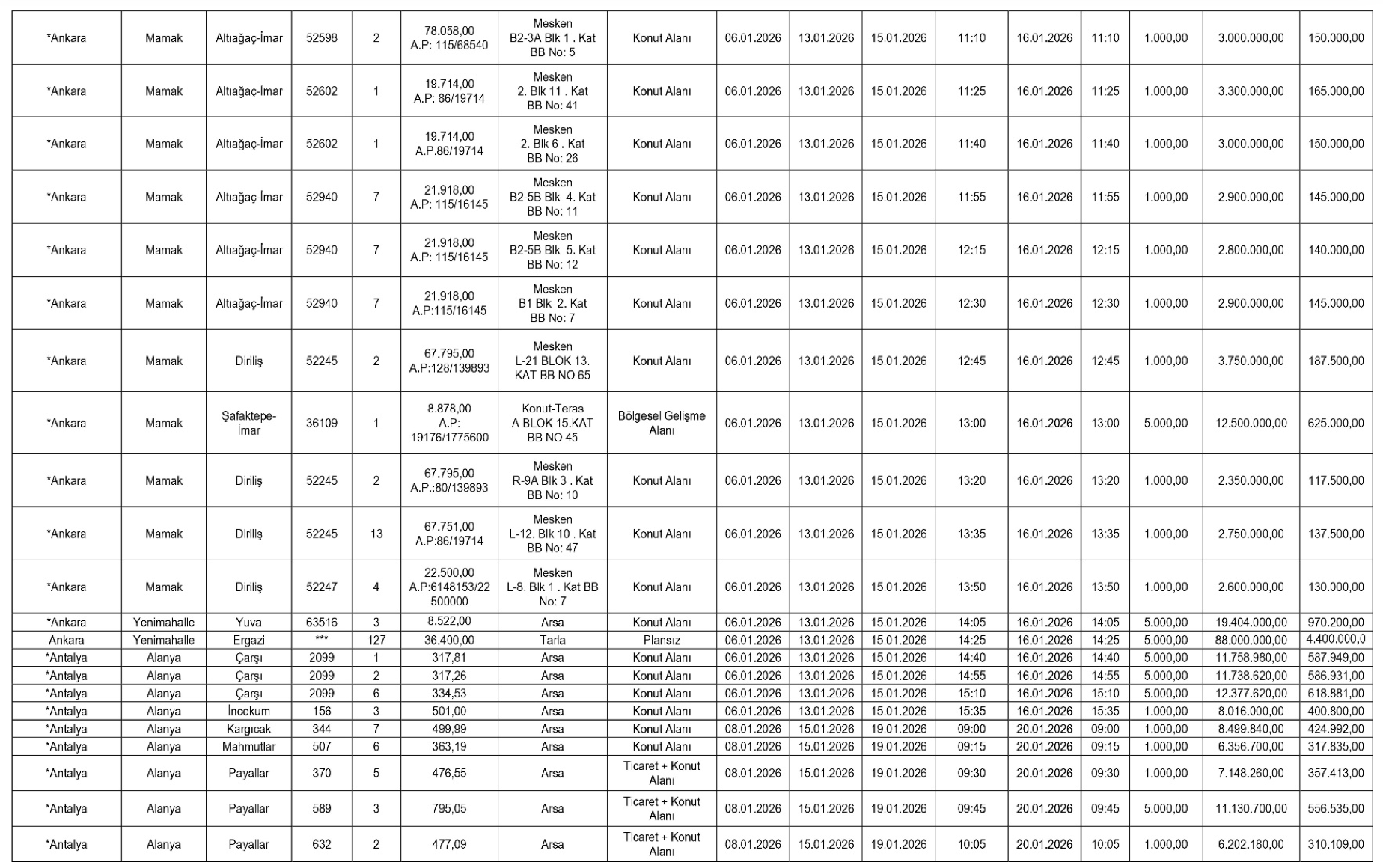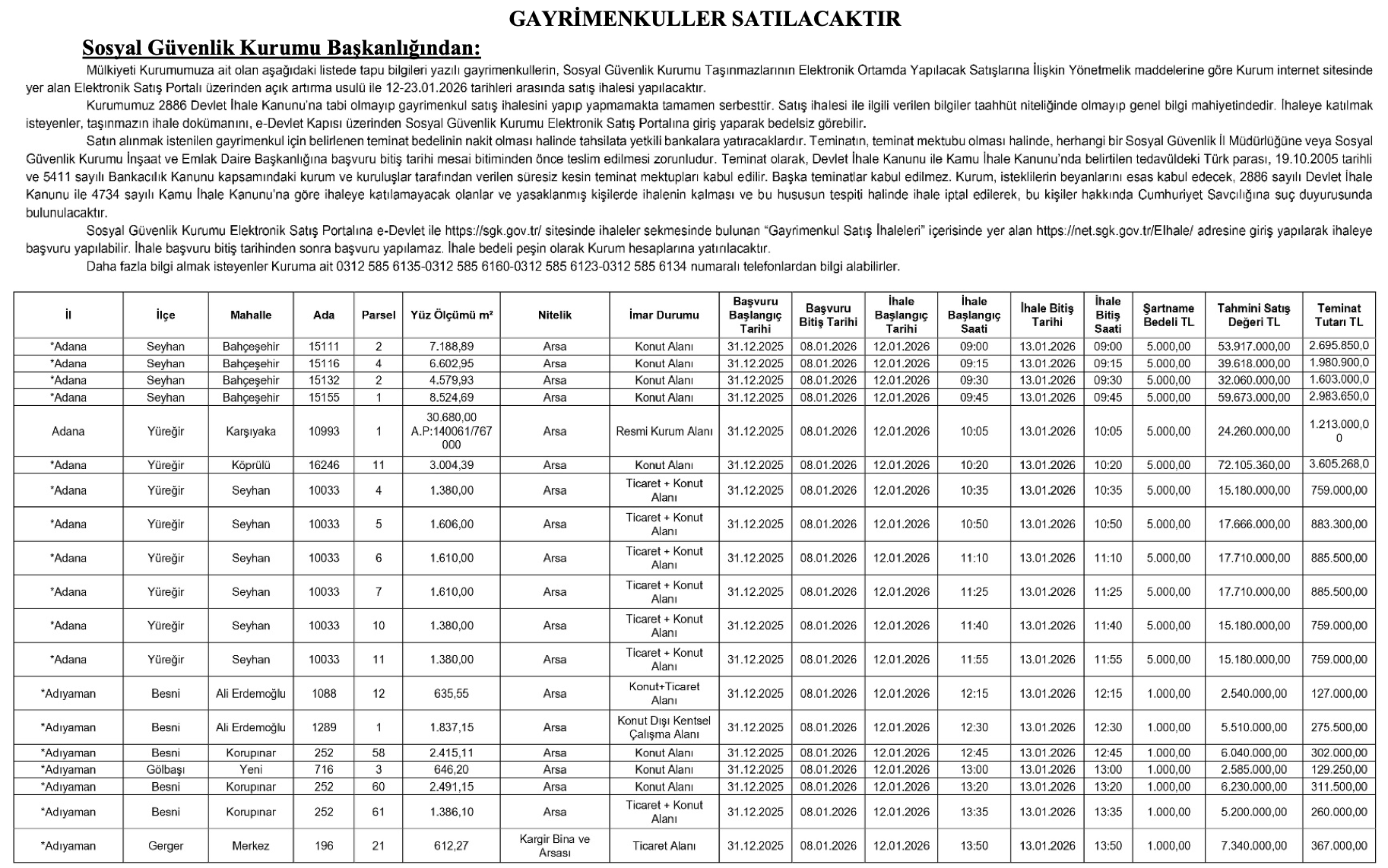 Teminat olarak yalnızca Türk Lirası ve Bankacılık Kanunu kapsamındaki kuruluşlarca düzenlenen süresiz kesin teminat mektupları kabul edilecek. İhaleyi kazananlar, satış bedelini peşin olarak SGK’nın ilgili hesaplarına yatırmakla yükümlü olacak.