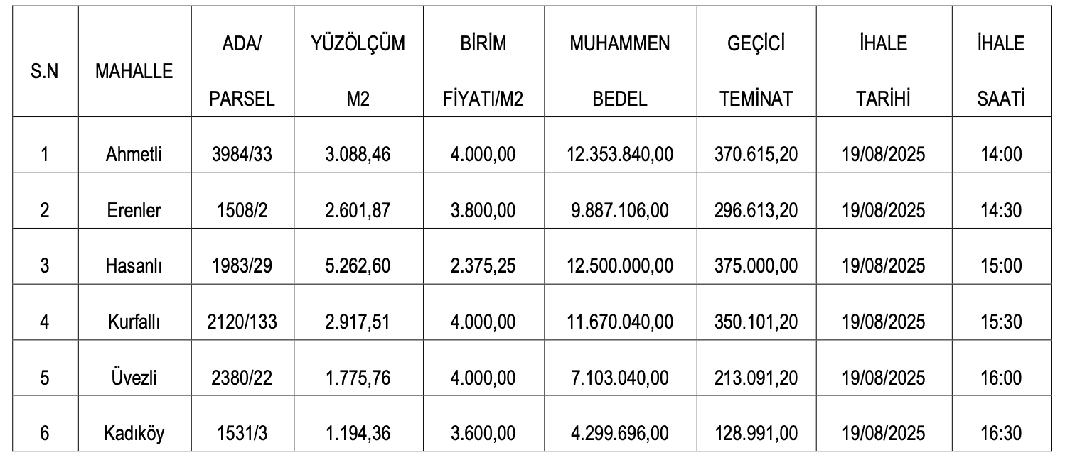 Söz konusu arsaların muhammen bedelleri 4 milyon 299 bin 696 TL ile 12 milyon 500 bin TL arasında farklılık gösterirken, geçici teminat bedelleri ise 128 bin 991 TL ile 375 bin TL arasında farklılık gösteriyor.
