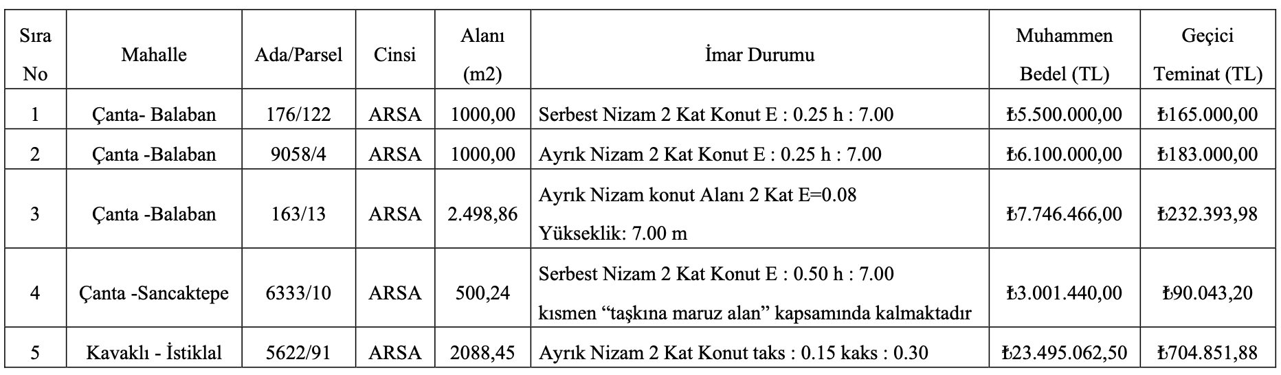 Konut alanı imarlı arsaların muhammen bedelleri 3 milyon 1 bin 440 TL ile 23 milyon 495 bin 63,50 TL arasında farklılık gösterirken, geçici teminat bedelleri ise 90 bin 43,20 TL ile 704 bin 851,88 TL arasında farklılık gösteriyor.