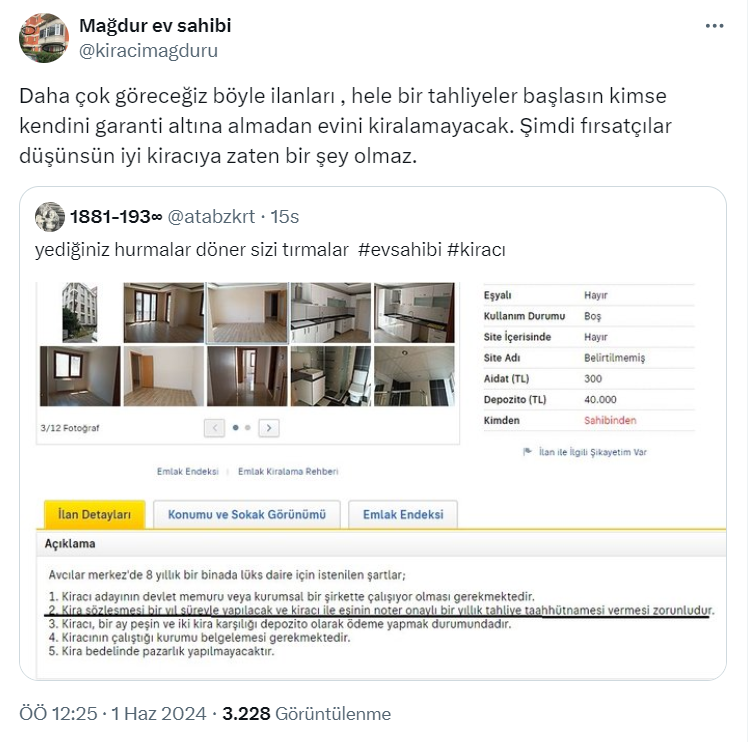 Mağdur ev sahibi X hesabı https://x.com/kiracimagduru üzerinden yaptığı paylaşımda kiralık bir ev ilanındaki şartlara dikkat çekerek, kimsenin kendini garanti altın almadan evini kiralamayacağını söyledi.
