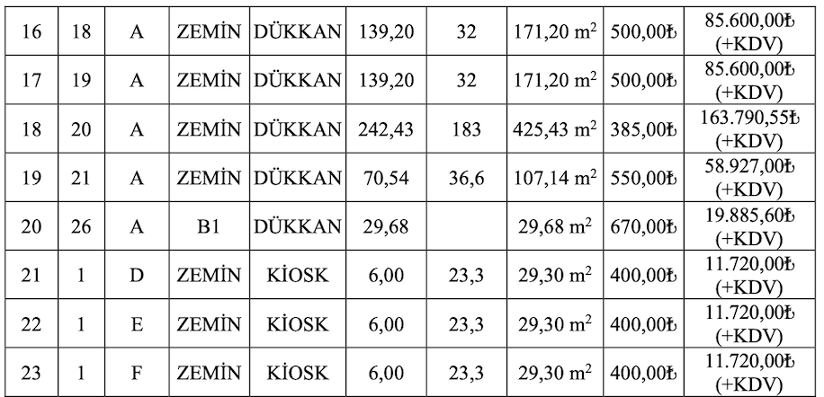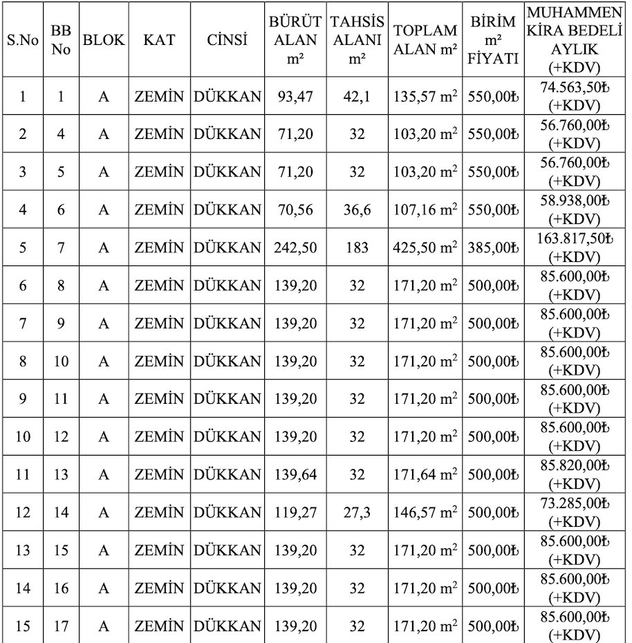 Dükkanların aylık kira bedelleri 19 bin 885,60 TL ile 163 bin 790,55 TL arasında farklılık gösterirken, kioskların kira bedelleri ise 11 bin 790 TL olarak açıklandı.