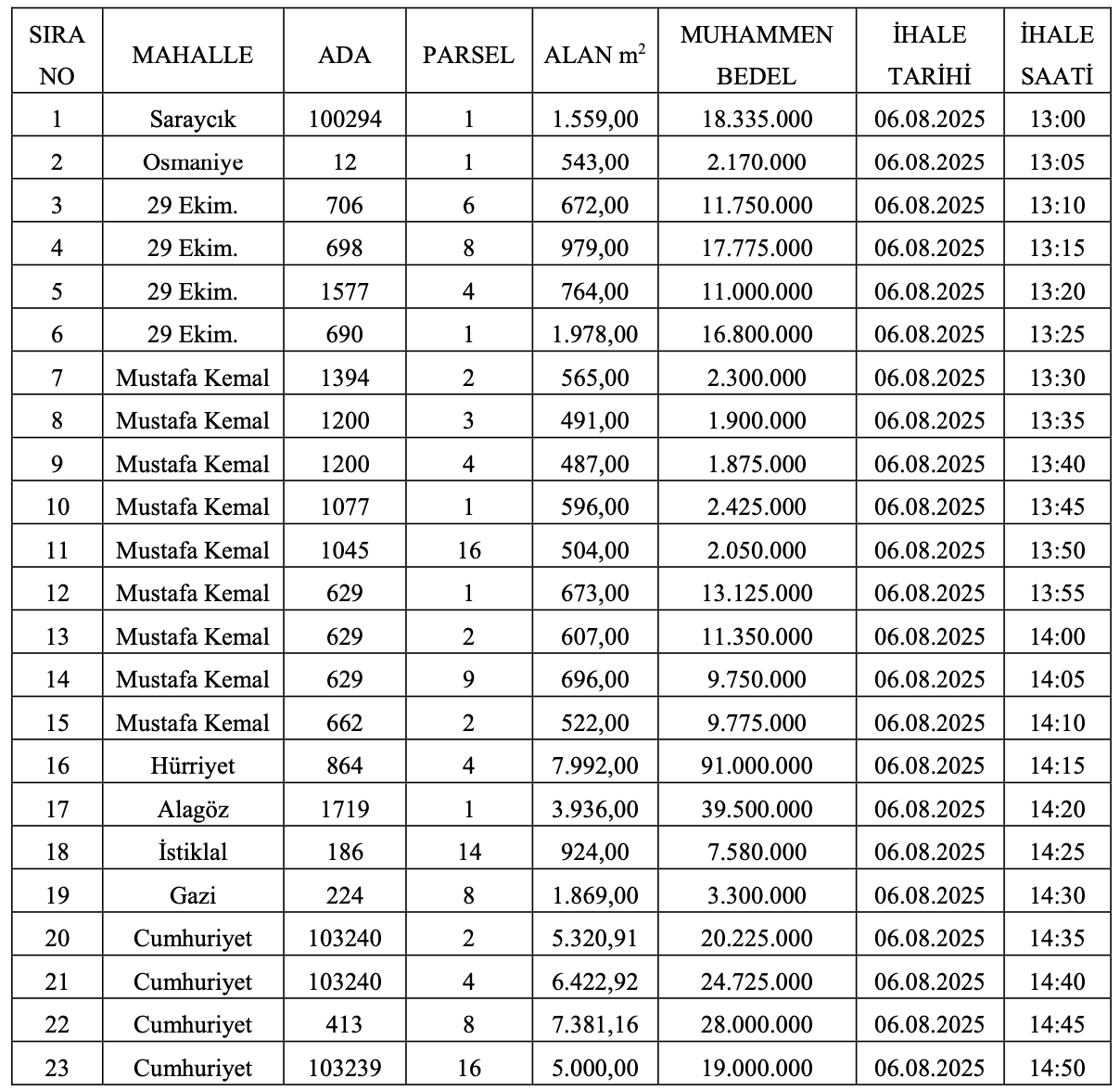 Saraycık, Osmaniye, 29 Ekim, Mustafa Kemal, Hürriyet, Alagöz, İstiklal, Gazi ve Cumhuriyet mahallelerinde yer alan arsaların satış ihalesi 6 Ağustos 2025 tarihinde saat 13.00 ile 14.50 arasında yapılacak.