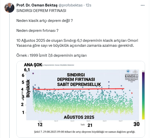 Depremin hemen ardından Prof. Dr. Osman Bektaş, Balıkesir için uyarı geldi. 'Sındırgı deprem fırtınası' diyen Prof. Dr. Osman Bektaş daha büyük depremlerin olabileceğini sosyal medya hesabından açıkladı.