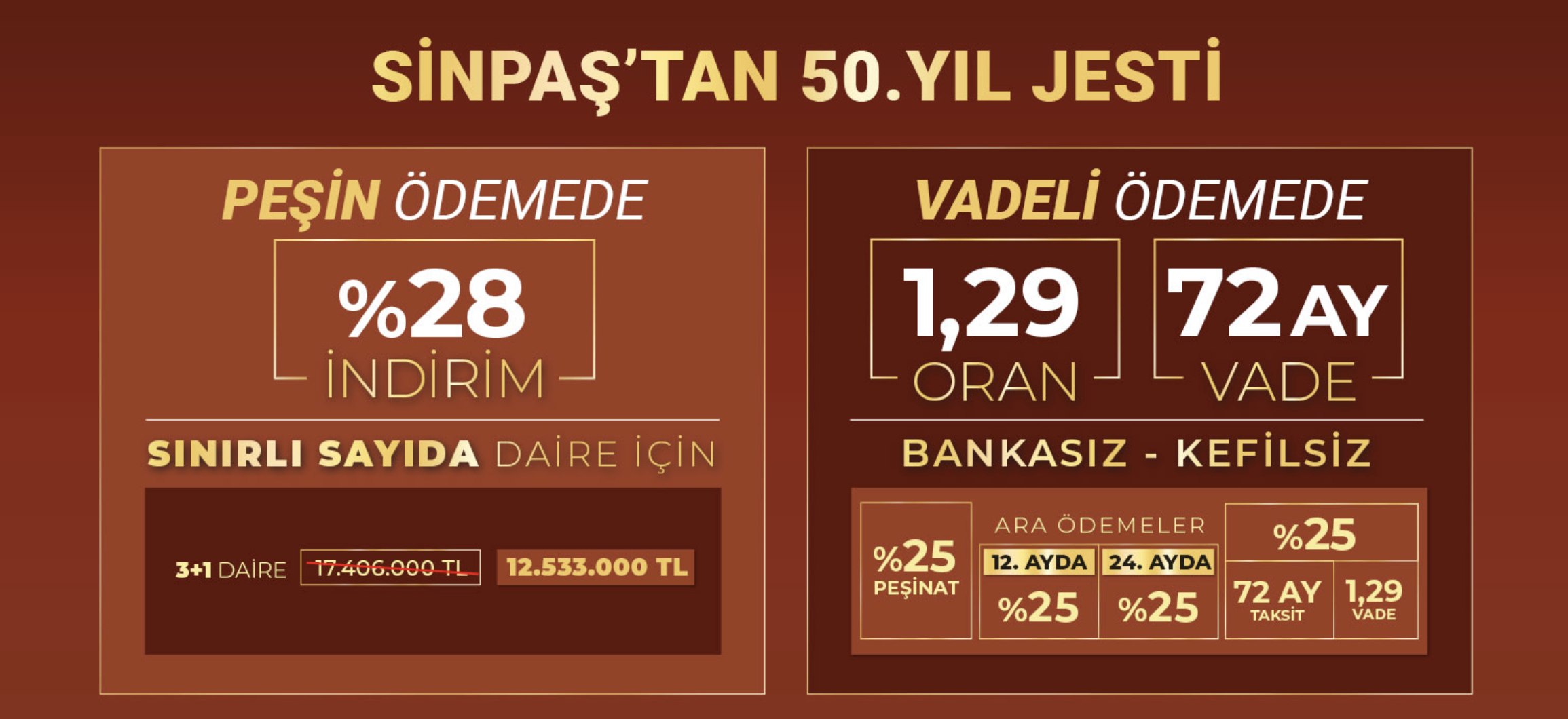 Sinpaş’ın 50. Yıl Jesti kapsamında Boulevard Çankaya projesinde yer alan sınırlı sayıda 3 oda 1 salon konutlar 17 milyon 406 bin TL yerine 12 milyon 533 bin TL’ye satılıyor.